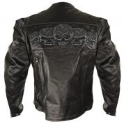 Designed with fine quality supple leather, this jacket has a stylish front panel of reflective skulls over the sleeve line which extends to the back. The mandarin collar of the jacket finishes at the opening of the zipped front closure. 2 side slit pockets and zipped cuffs keeps you completely comfy. 2 back zipped vents are meant for apt ventilation